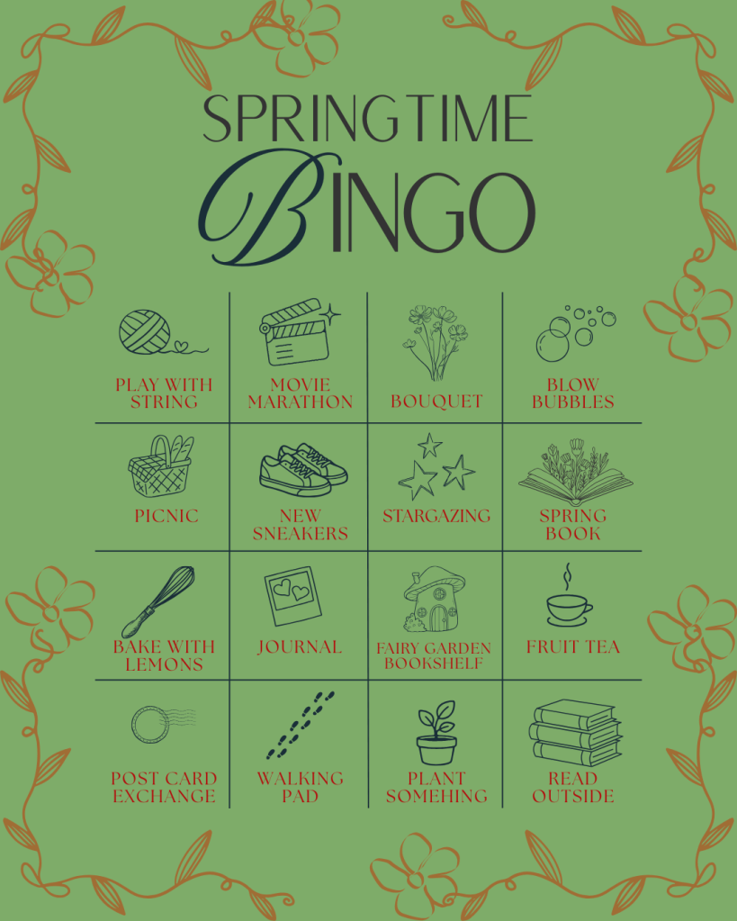 If you play along with my Spring Bingo board and black out all 16 squares tag me on Instagram and let me know. When you do I’ll send you an eBook of your choice for finishing. (This is done through Bookfunnel.) The first week of June I will pick one finisher in a random draw to receive a signed paperback of Eagle Moon.